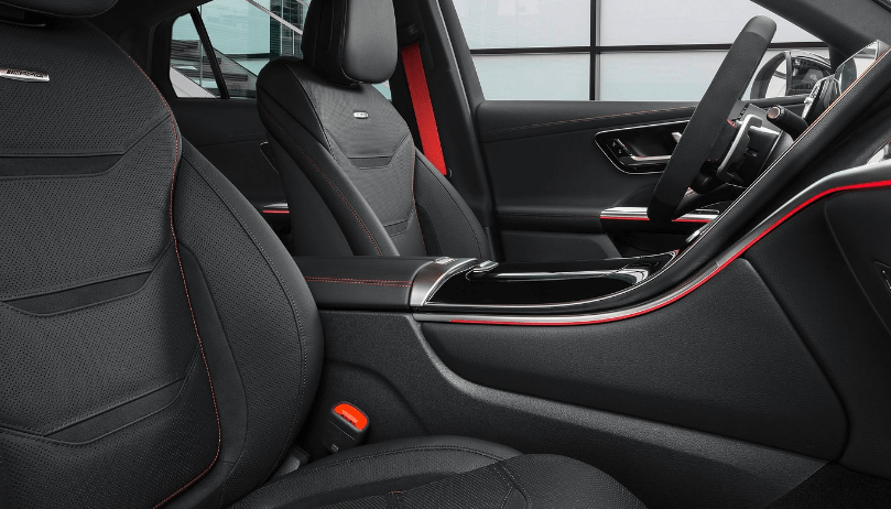 기본 시트는 유료로 가죽 또는 나파 가죽을 옵션으로 선택할 수 있으며, 나파 가죽으로 감싼 AMG 퍼포먼스 스티어링 휠과 조화를 이룹니다.
