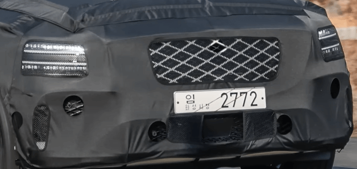 먼저 전면부에선 헤드램프가 눈길을 끕니다. 디자인과 아웃라인은 현행 GV80과 동일해 보이는데 안쪽 그래픽 변화가 큽니다. 플래그십 세단 G90와 전용전기차 GV60에 적용된 MLA(Micro Lens Array) 타입 풀 LED 램프로 새롭게 변경됩니다.