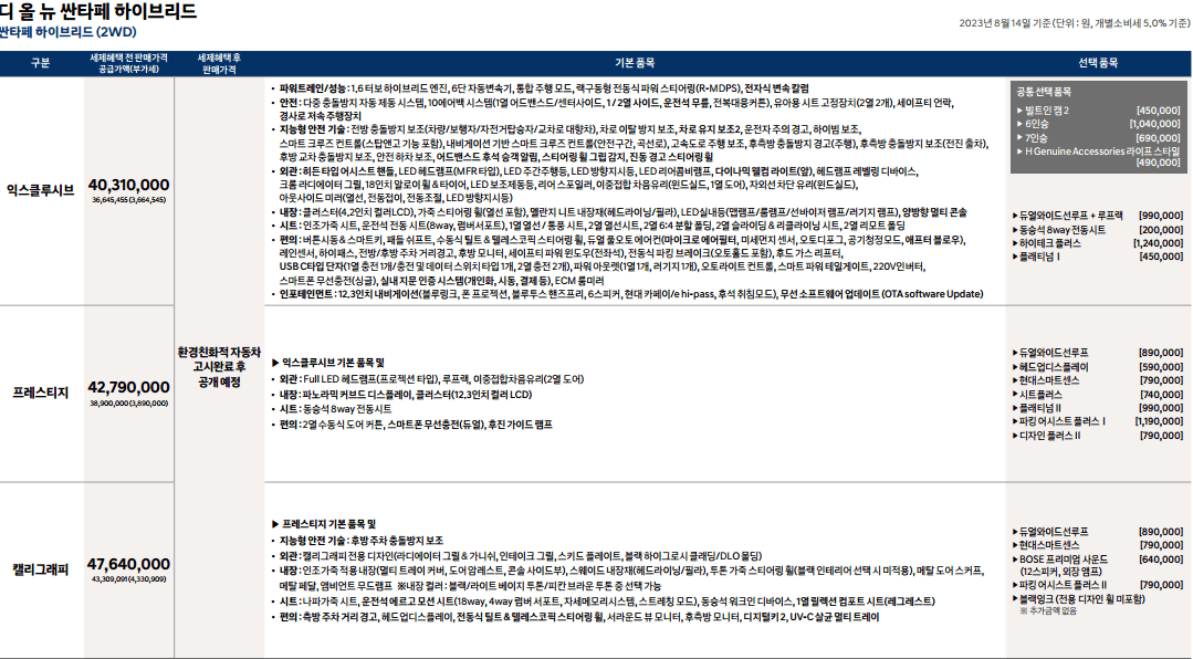 싼타페 풀체인지 세부 가격은 가솔린 2.5 터보 익스클루시브 3546만원, 프레스티지 3794만원, 캘리그래피 4373만원입니다. 1.6 터보 하이브리드 가격은(환경 친화적 자동차 고시 이전으로 세제혜택 적용 전) 익스클루시브 4031만원, 프레스티지 4279만원, 캘리그래피 4794만원입니다. 디 올 뉴 싼타페의 가격이 인상이 되었습니다.