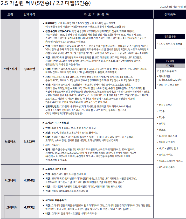 노블레스는 4112만원(+200만원), 시그니처 4366만원(+157만원), 그래비티는 4455만원(+157만원)입니다. 세제혜택을 받지 못하는 1.6 터보 하이브리드 4WD 가격은 4161~4831만원으로 책정되었다. 트림에 따라 최소 160만원, 최대 206만원 올랐습니다.