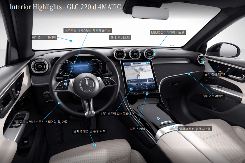 벤츠 GLC 풀체인지의 실내는 넉넉한 공간감을 보여줍니다. 차량 중앙에 위치한 11.9인치 LED 디스플레이에는 벤츠의 인포테인먼트 시스템인 2세대 MBUX가 탑재돼 보다 직관적이고 디지털화된 사용자 경험을 제공하고,. 운전석에는 12.3인치 고해상도 스크린이 적용돼 운전자는 주행에 필요한 다양한 정보를 확인할 수 있습니다.