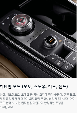 7. 편의 : 버튼시동 스마트키 시스템(원격시동 포함), 전자식 파킹 브레이크(오토홀드 포함), 전자식 변속 다이얼, 패들 쉬프트, 후방 모니터, 열선 스티어링 휠, 수동식 틸트&텔레스코픽 스티어링 휠, 독립제어 풀오토 에어컨(운전석/동승석), 인포테인먼트/공조 전환 조작계,