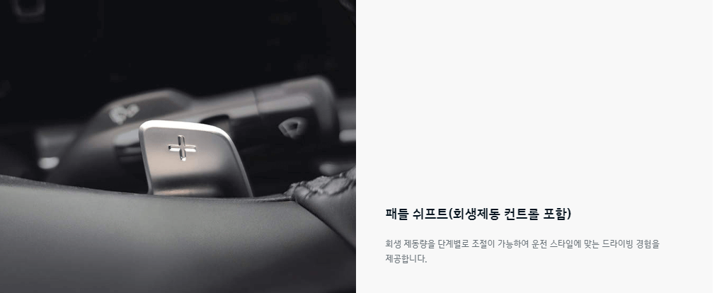 하이브리드는 전기모터를 제어해 승차감과 민첩성 및 주행 안정성을 높여주는 e-라이드, e-핸들링 등을 탑재했습니다. 하이브리드 전용 콘텐츠와 회생제동 컨트롤을 제공합니다.